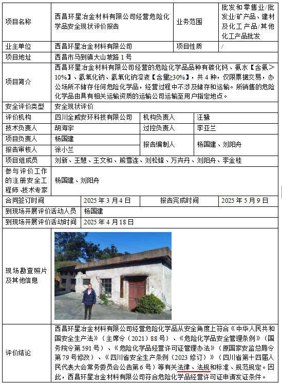 西昌环星冶金材料有限公司经营危险化学品安全现状评价报告