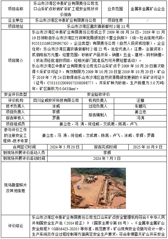 乐山市沙湾区中泰矿业有限责任公司龙口山采矿点砂岩矿采矿工程安全现状评价报告
