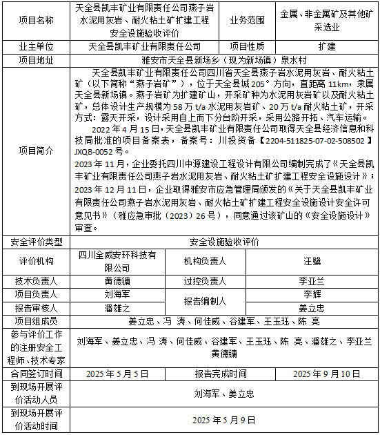 天全县凯丰矿业有限责任公司燕子岩水泥用灰岩、耐火粘土矿扩建工程 安全设施验收评价