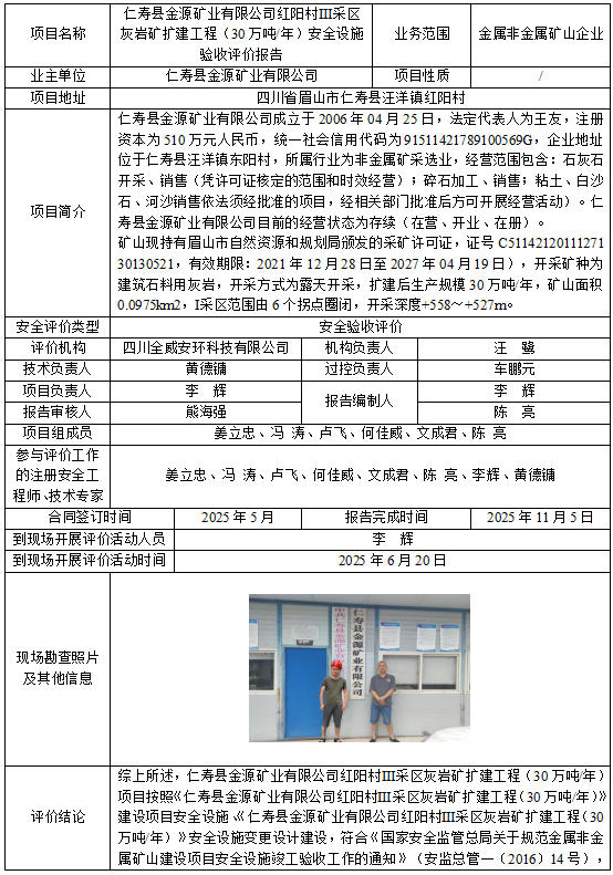 仁寿县金源矿业有限公司红阳村Ⅲ采区灰岩矿扩建工程(30万吨/年)安全设施验收评价报告