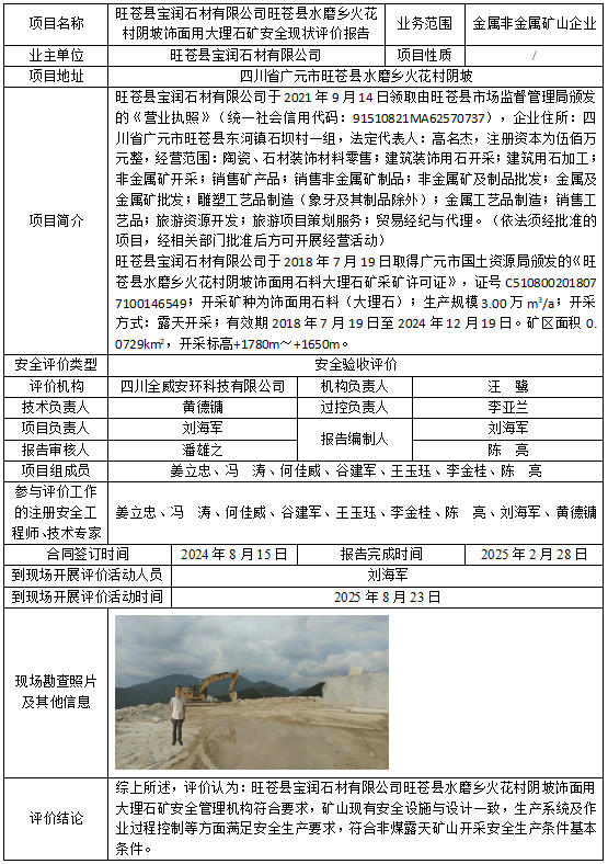 旺苍县宝润石材有限公司旺苍县水磨乡火花村阴坡饰面用大理石矿安全现状评价报告
