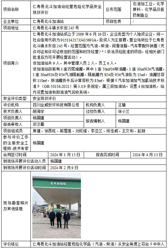 仁寿县北斗加油站经营危险化学品安全现状评价