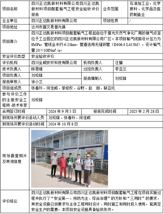 四川正达凯新材料有限公司四川正达凯新材料项目配套输气工程安全验收评价报告
