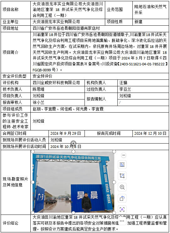 大庆油田龙丰实业有限公司大庆油田川渝地区潼深 18 井试采天然气净化及综合利用工程(一期)