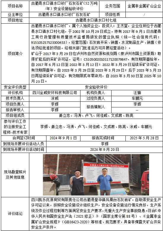 古蔺县水口镇水口砂厂石灰石矿(52万吨/年)安全设施验收评价