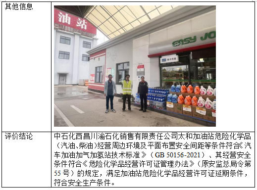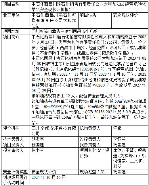 中石化西昌川渝石化销售有限责任公司太和加油站经营危险化学品安全现状评价报告