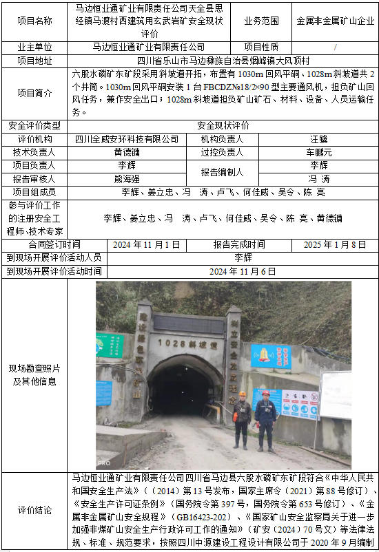 马边恒业通矿业有限责任公司天全县思经镇马渡村西建筑用玄武岩矿安全现状评价