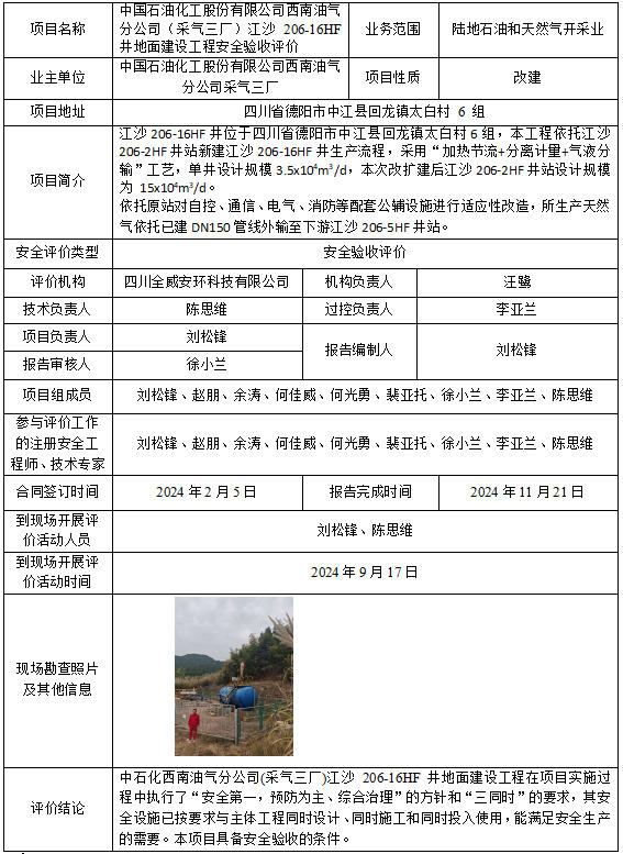 中国石油化工股份有限公司西南油气分公司(采气三厂)江沙 206-16HF 井地面建设工程安全验收评价