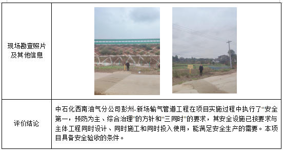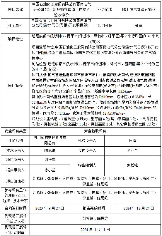 中国石油化工股份有限公司西南油气分公司彭州-新场输气管道工程安全验收评价