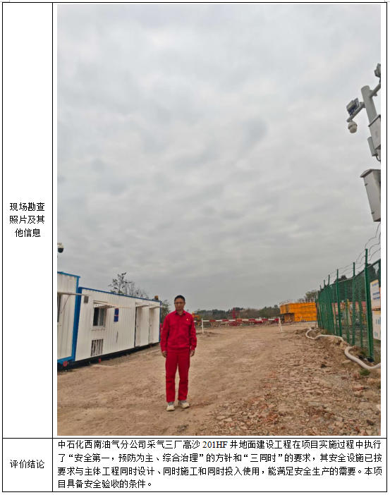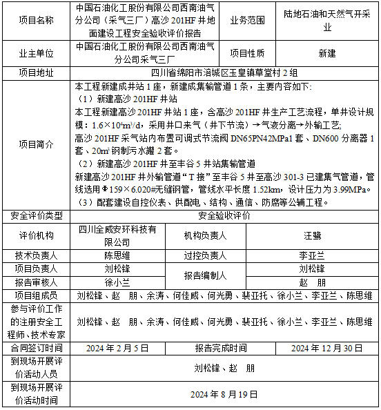 中国石油化工股份有限公司西南油气分公司(采气三厂)高沙201HF井地面建设工程安全验收评价报告