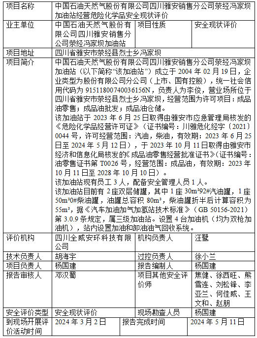 中国石油天然气股份有限公司四川雅安销售分公司荥经冯家坝加油站经营危险化学品安全现状评价