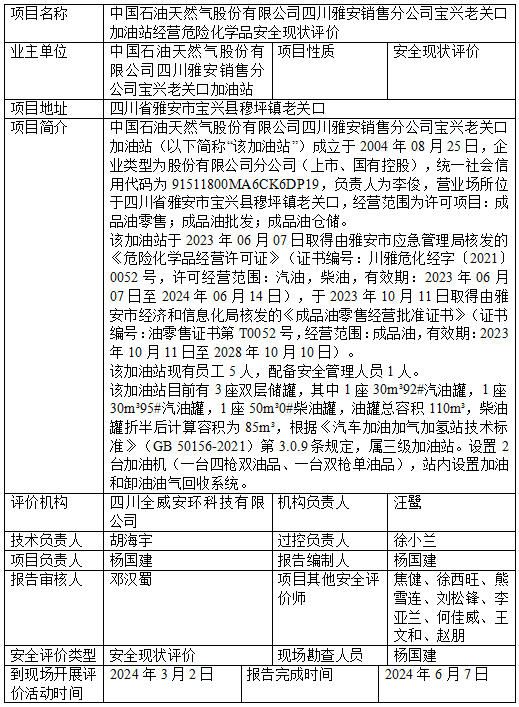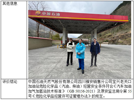 中国石油天然气股份有限公司四川雅安销售分公司宝兴老关口加油站经营危险化学品安全现状评价