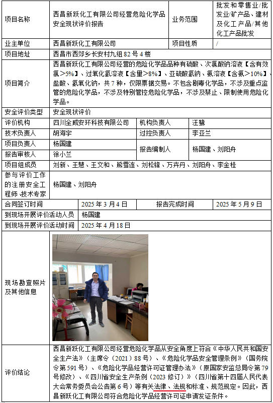 西昌新跃化工有限公司经营危险化学品安全现状评价报告