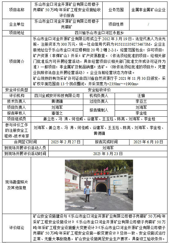 乐山市金口河金开源矿业有限公司椒子岗磷矿50万吨/年采矿工程安全设施验收评价报告