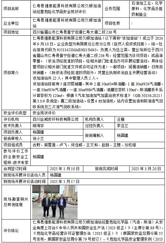 仁寿县捷泰能源科技有限公司久顺加油站经营危险化学品安全现状评价