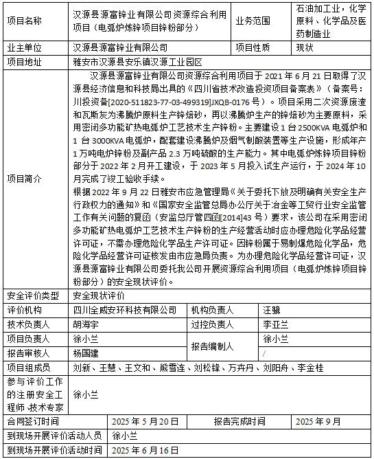汉源县源富锌业有限公司资源综合利用项目(电弧炉炼锌项目锌粉部分)