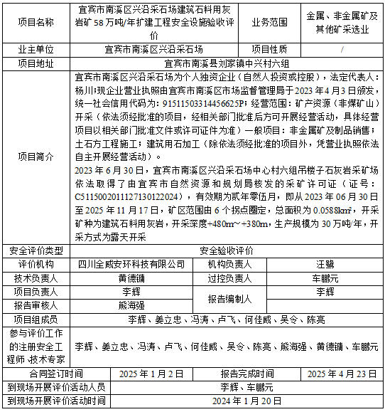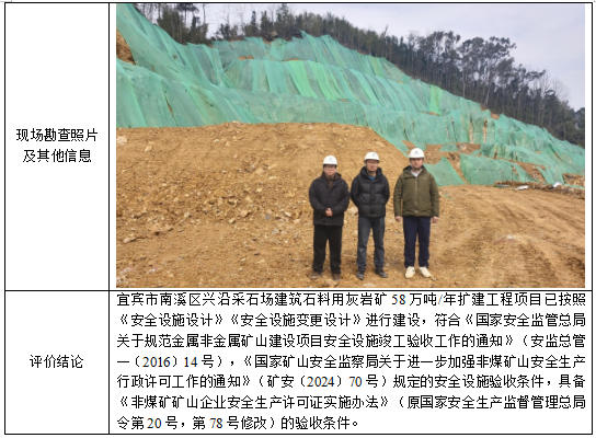 宜宾市南溪区兴沿采石场建筑石料用灰岩矿58万吨/年扩建工程安全设施验收评价