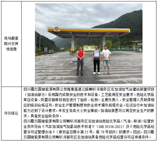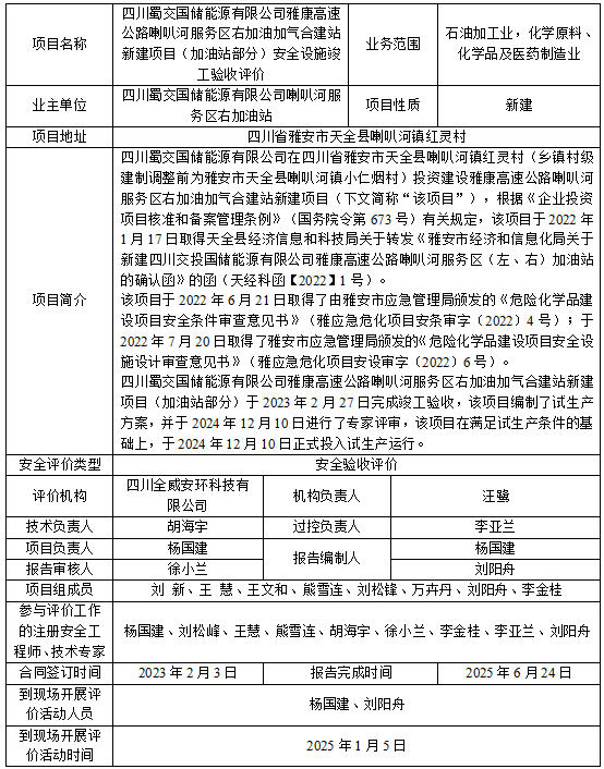 四川蜀交国储能源有限公司雅康高速公路喇叭河服务区右加油加气合建站新建项目(加油站部分)安全设施竣工验收评价