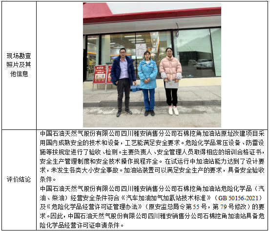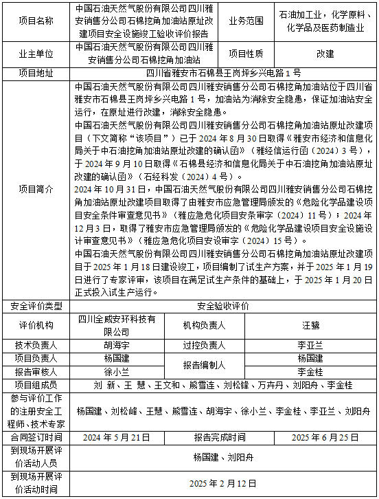 中国石油天然气股份有限公司四川雅安销售分公司石棉挖角加油站原址改建项目安全设施竣工验收评价报告